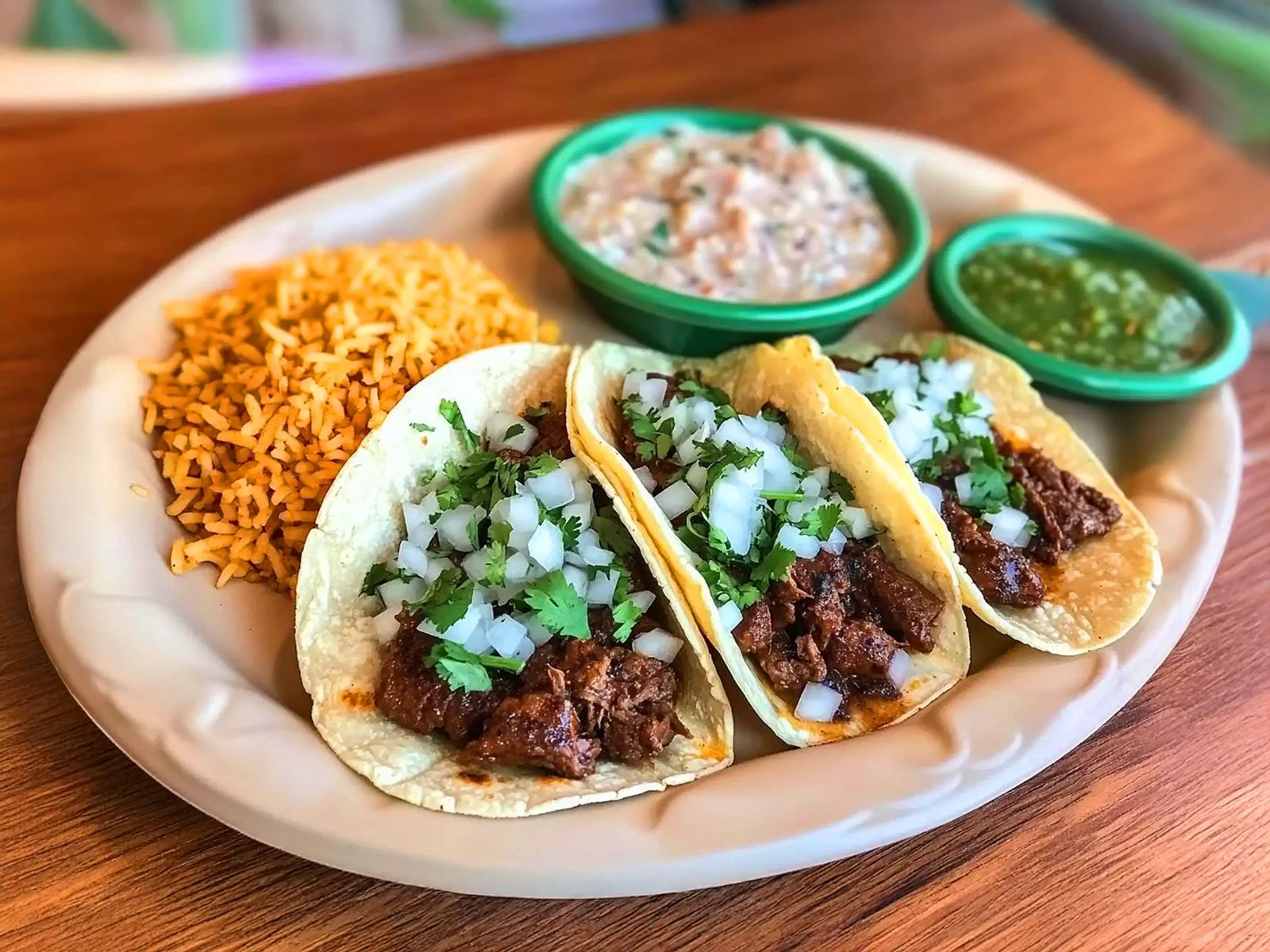 Three tacos with your choice of meat. Served with rice and beans. Crispy or soft.