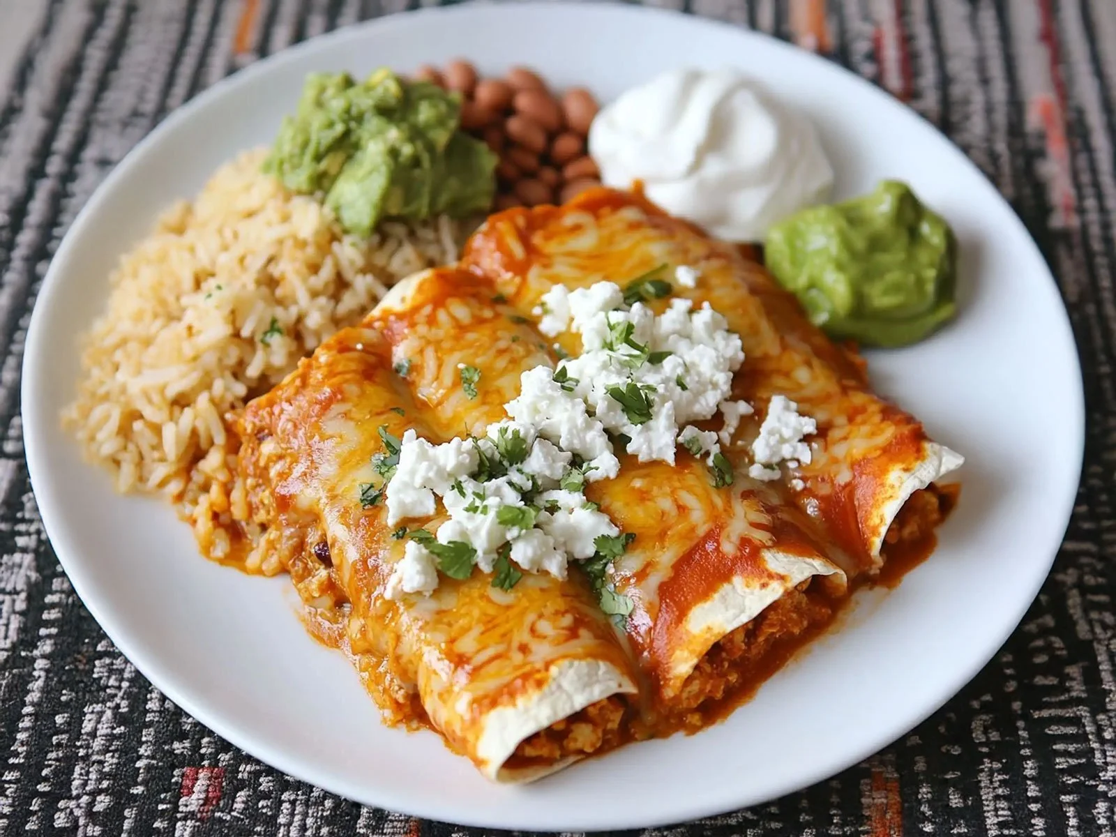 Three enchiladas filled with your choice of meat, topped with green, red, or mole sauce and cheese. Served with rice and beans